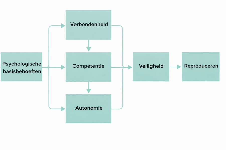 Ieder mens op deze aarde heeft drie psychologische basisbehoeftes: sociale verbondenheid, competentie en autonomie. Deze basisbehoeftes kunnen gefrustreerd raken, wat effect heeft op je gedrag. Vanuit de evolutietheorie is het waarborgen van de veiligheid een belangrijk aspect. Zodra één of meerdere psychologische basisbehoeftes gefrustreerd zijn betekent het dat er een ‘onveilig’ gevoel ontstaat. Het is belangrijk dat de psychologische basisbehoeftes bevredigd worden. Om gemotiveerd te blijven is het belangrijk dat al deze basisbehoeften vervuld worden.