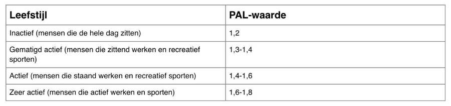 In de vorige stap heb je berekent wat je lichaam in rust gebruikt, inclusief het effect van voeding erop. Nu blijven de dagelijkse activiteiten over om het uiteindelijke energiegebruik te berekenen. Je vermenigvuldigt het rustmetabolisme met de PAL-waarde om het energiegebruik te krijgen, bijvoorbeeld 1400 kcal x 1,3 = 1820 kcal. Hieronder staat een tabel die weergeeft welke toeslagfactoren bij welk activiteitenpatroon horen.